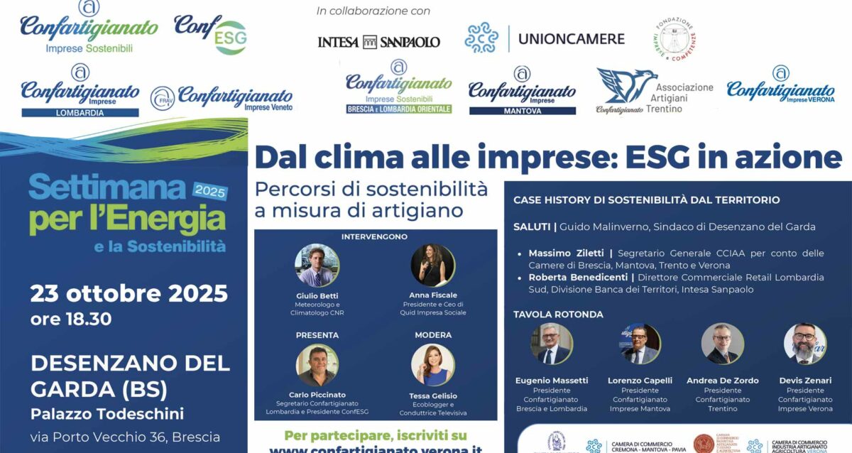SETTIMANA ENERGIA SOSTENIBILITA’ – Il 23 ottobre a Desenzano l’evento “Dal clima alle imprese: ESG in azione. Percorsi di sostenibilità a misura di artigiano”