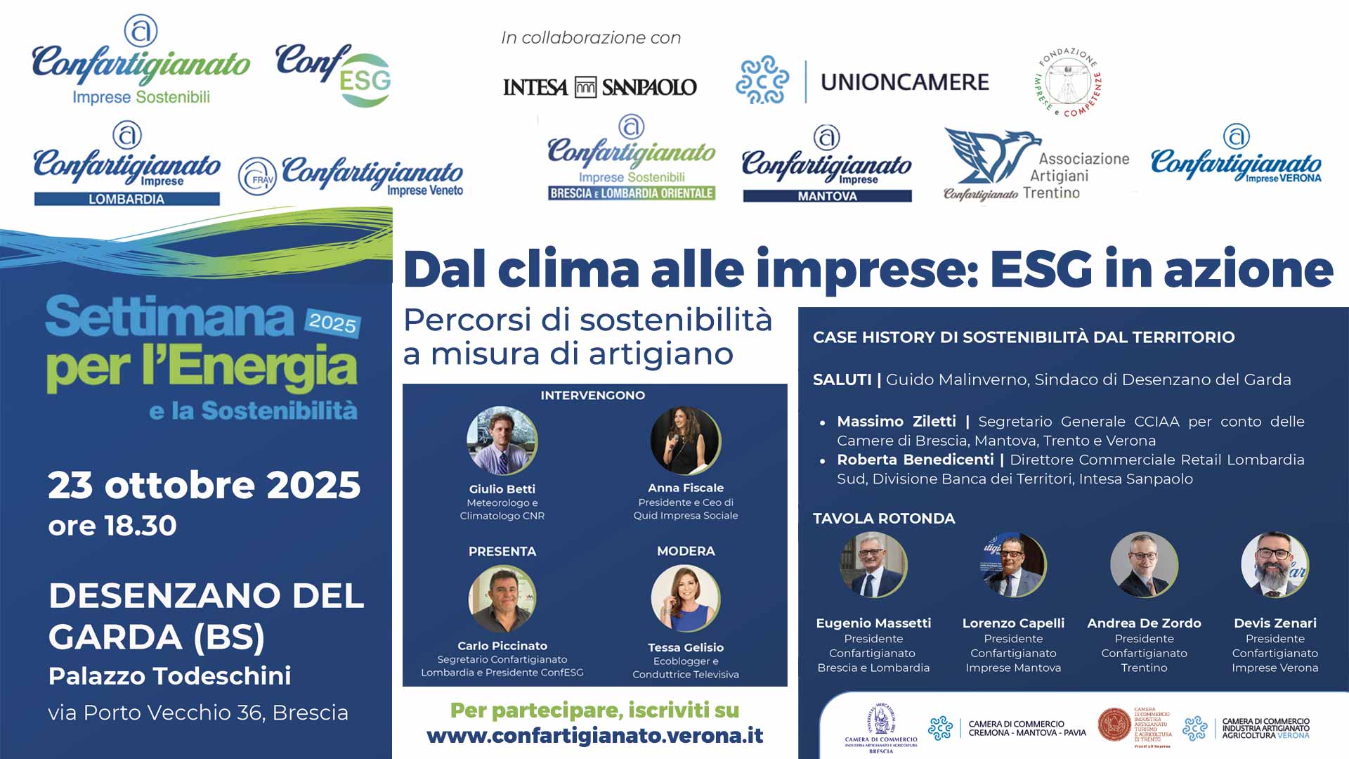 Per l’occasione le Confartigianato del Garda – Verona, Brescia e Lombardia Orientale, Mantova e Trentino – propongono in sinergia l’incontro “DAL CLIMA ALLE IMPRESE: ESG IN AZIONE. Percorsi di sostenibilità a misura di artigiano”, in programma giovedì 23 ottobre 2025 alle ore 18:30 a Desenzano del Garda (BS), presso Palazzo Todeschini, via Porto Vecchio 36.